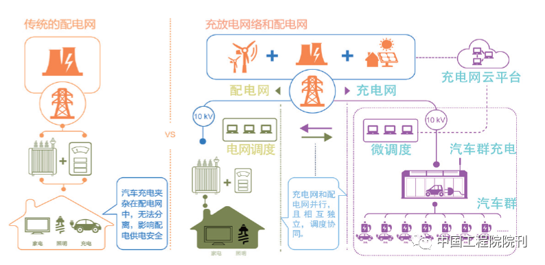 普及基礎(chǔ)設(shè)施建設(shè),提高用戶使用便捷性和滿意度是推動新能源汽車廣泛應(yīng)用的關(guān)鍵。近年來,我國電動汽車充電樁發(fā)展迅速,截至2018年12月,我國部署公共類充電樁299 752臺,同比增長40.1%。雖然充電基礎(chǔ)設(shè)施發(fā)展較快,但是行業(yè)仍然面臨著基礎(chǔ)不牢固、發(fā)展不均衡不充分等問題。更為重要的是,隨著我國電動汽車數(shù)量的迅速增長,車輛在用電高峰的無序充電可能會對電網(wǎng)造成沖擊,同時也會增加用戶的充電成本。因此,應(yīng)著眼構(gòu)建能夠?qū)⒈姸喑潆姌痘ヂ?lián)控制的充電網(wǎng)體系(見圖3),并可以與配電網(wǎng)耦合交互,實現(xiàn)充電網(wǎng)與配電網(wǎng)的協(xié)同調(diào)度,通過利用晚上低谷電力充電,或者利用太陽能、風(fēng)能直接或經(jīng)過儲能設(shè)備充電,實現(xiàn)電動汽車的有序充電和電網(wǎng)運(yùn)行的削峰填谷。此外,還可以利用電網(wǎng)無法消納的太陽能、風(fēng)能進(jìn)行制氫儲能,為氫燃料電池汽車提供加氫服務(wù)。