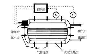 在外容器上設置一個與夾層連接的金屬儲氫小室,所使用儲氫金屬在常溫下可以達到很高的真空度。儲氫金屬加熱時,釋放出數(shù)毫克的氫氣,夾層的壓力上升,環(huán)境熱量通過夾層導入內(nèi)容器。停止加熱后,氫氣迅速被儲氫金屬吸附,真空壓力和夾層絕熱能力恢復。這種方式通過小功率的加熱,即可對容器內(nèi)部輸入較大熱流,消耗電能僅為壓力維持總能量的5%,因此,這種模式可以稱為熱放大器。