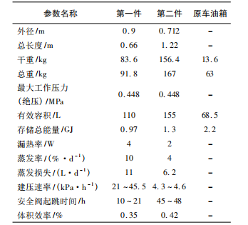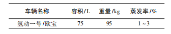上世紀80年代初,作為美國能源部(Depart-mentofEnergy,DOE)“替代燃料實施項目”的一部分,LASL同聯(lián)邦德國航空航天研究試驗院(DFVLR)、新墨西哥能源研究所(NMEI)合作,對氫能汽車進行了為期兩年半的試驗研究工作,該項試驗的首要任務是研究車載液氫存儲和加注。測試的液氫氣瓶包括兩件,并采用通用(GM)公司別克1979款“世紀”汽油內(nèi)燃機轎車作為載體進行了路試,氣瓶與原車汽油箱參數(shù)如表2所示。
