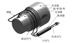 為此,林德公司冷量回收技術,實現(xiàn)了車輛停放時液氫無損存儲12d的記錄,其氣瓶結構原理如圖2所示。在氣瓶向發(fā)動機供氣時,采用氣化換熱器獲得液化空氣,存儲冷量。停車后,氣瓶不工作時,液化空氣進入夾層空間外側,吸收外界漏熱,從而實現(xiàn)更長的液氫無損儲存時間。