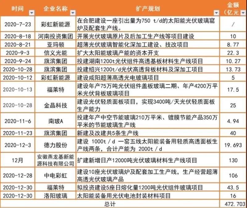 備注:2020年下半年光伏玻璃產(chǎn)能擴(kuò)充統(tǒng)計(jì)(僅供參考)