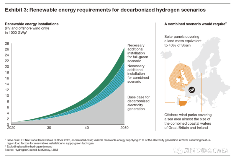 氫脫碳情景下可再生能源需求情況(混合模式下,用太陽(yáng)能的話面積相當(dāng)于40%西班牙國(guó)土面積,用海上風(fēng)電則需要在英國(guó)和愛(ài)爾蘭海域全部安裝上風(fēng)機(jī))