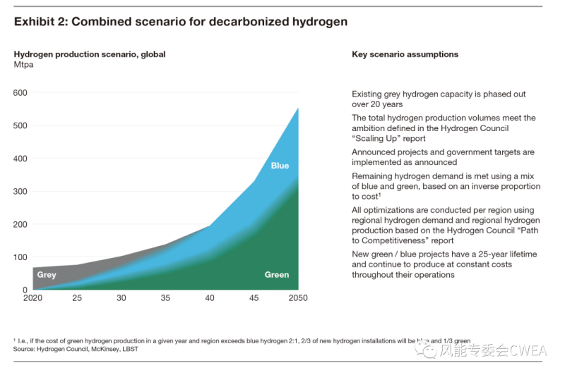 3)兩種脫碳途徑相結(jié)合的方案,該方案根據(jù)來(lái)源的預(yù)期區(qū)域成本情況,使用綠氫和藍(lán)氫的特定組合。