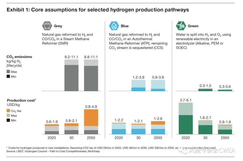 圖1:2030和2050年制氫途徑的碳排放量比較
