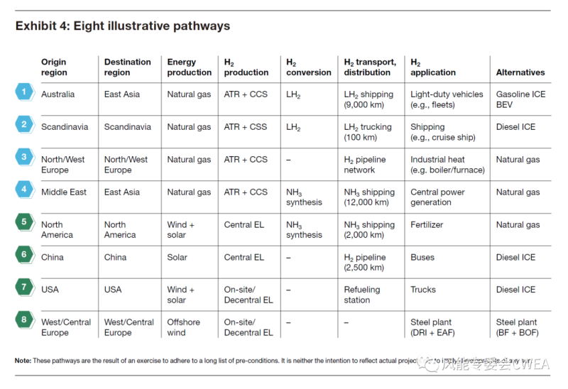 報(bào)告從一次能源到氫能過(guò)程選擇了8個(gè)價(jià)值鏈進(jìn)行說(shuō)明。