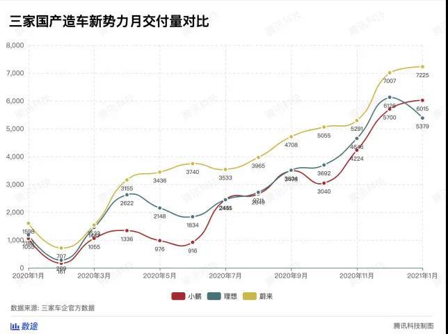 根據(jù)三家車企官方數(shù)據(jù)顯示,2021年1月,三家車企中交付量最高的依然是蔚來,1月交付了7225輛車;小鵬交付6015輛汽車,位列第二;理想汽車交付了5379輛車,盡管依然是單一車型交付冠軍,但環(huán)比增速在三家里是唯一負增長的。
