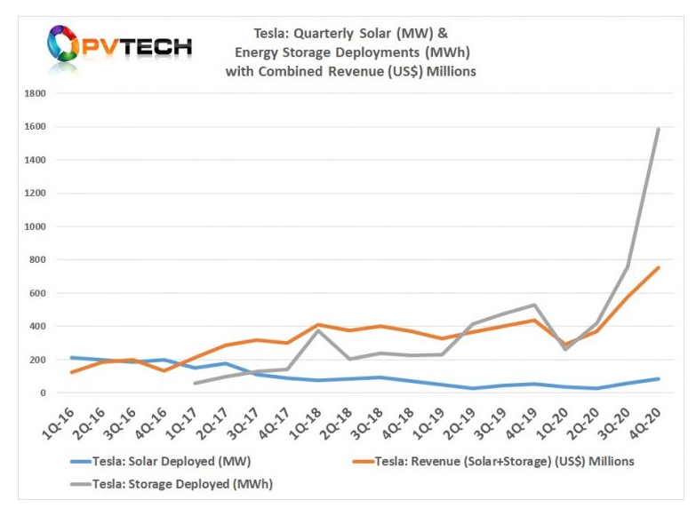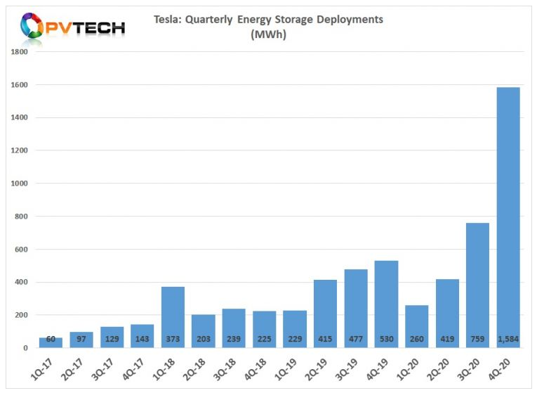 特斯拉公司在2020年第四季度部署的儲能系統(tǒng)(EES)儲能容量達到創(chuàng)紀(jì)錄的1,584MWh,而第三季度為759MWh。盡管該公司住宅儲能部署也在增長,但部署了更多電網(wǎng)規(guī)模的儲能系統(tǒng)是其實現(xiàn)顯著增長的關(guān)鍵。