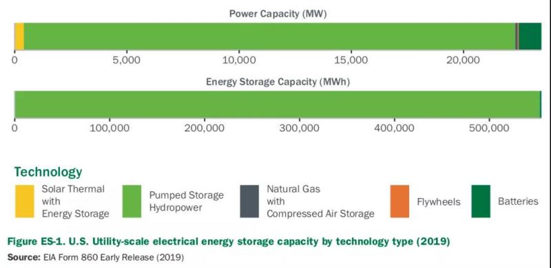 抽水蓄能系統(tǒng)占美國電網(wǎng)蓄能容量的93%,其增長速度幾乎與所有其他蓄能技術(shù)的總和一樣快。2019年,43座抽水蓄能發(fā)電廠的總裝機(jī)容量為21.9吉瓦,儲能容量為553吉瓦時,占公用事業(yè)規(guī)模儲能容量(GW)的93%,占電能儲存(GWh)的99%以上。從2010年到2019年,抽水蓄能的新增裝機(jī)容量(1333MW)接近美國所有其他形式的儲能裝機(jī)容量(1675MW)增量。