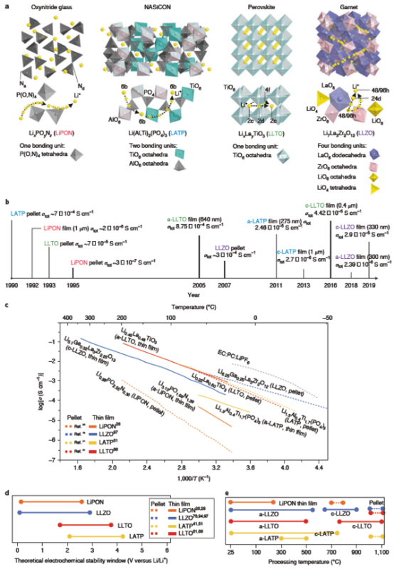 在室溫下達(dá)到電導(dǎo)率10-7–10-3 S·cm-1的鋰離子傳導(dǎo)陶瓷是基于氧氮化物玻璃(LiPON)和NASICON型、鈣鈦礦型和石榴石型結(jié)構(gòu)(圖3a)。要將鋰離子傳導(dǎo)陶瓷從傳統(tǒng)的大顆粒轉(zhuǎn)變?yōu)閿?shù)百納米厚的薄膜,需要付出巨大的努力:平均而言,從相應(yīng)的顆粒開(kāi)始,需要十多年的額外開(kāi)發(fā)時(shí)間來(lái)了解陶瓷膜的化學(xué)、沉積和特性(圖3b)。LiPON是一個(gè)例外,它的薄膜加工路線是在無(wú)定形LiPON顆粒之前建立的。對(duì)這些陶瓷薄膜進(jìn)行加工的未來(lái)機(jī)遇在于確定其化學(xué)性質(zhì),并更深入地了解其結(jié)構(gòu)、相和鋰離子傳輸之間的關(guān)系,這將在決定它們作為未來(lái)固態(tài)電池的“薄”電解質(zhì)方面發(fā)揮作用(圖3c-e)。