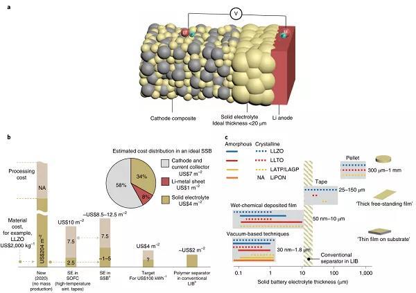 估算固態(tài)電池生產(chǎn)鏈成本(即加工和材料成本)是十分重要的任務(wù)。研究結(jié)果表明,如果我們繼續(xù)依賴(lài)傳統(tǒng)的高溫?zé)Y(jié)成條工藝,即使原材料價(jià)格低至US$10 kg-1,也會(huì)導(dǎo)致氧化物基電池在經(jīng)濟(jì)上不可行。最近,根據(jù)能源部的成本目標(biāo)和當(dāng)前0.2k Wh m-2(5 mAh cm-2)的鋰離子電池能量密度,提出了一個(gè)大約US$10-12 m-2的固態(tài)電池成本準(zhǔn)則。正極和集流體的估算成本約為US$7 m-2,20 μm鋰金屬箔的估算成本約為US$1 m-2,因此,固體電解質(zhì)的估算成本需低于US$4 m-2 (圖1b)。