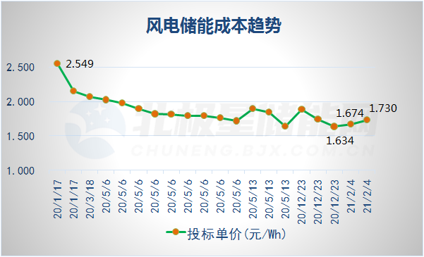 據(jù)北極星儲能網(wǎng)統(tǒng)計,自2020年1月到現(xiàn)在已有7個風(fēng)電儲能項(xiàng)目公開投標(biāo)價格,在2020年風(fēng)電配套儲能工程成本單價從最高2.549元/Wh,降到了最低1.634元/Wh,降幅達(dá)到36%。此次開標(biāo)的國華竹根沙海上風(fēng)電儲能電站工程,是國內(nèi)首個海上風(fēng)電配套儲能項(xiàng)目,兩家中標(biāo)候選人的報價成本與2020年的陸上風(fēng)電配套儲能成本最低價非常接近。