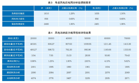 調(diào)頻約束下風(fēng)電消納能力評估。首先根據(jù)該省級電網(wǎng)風(fēng)電的歷史出力特性,模擬生成規(guī)劃年風(fēng)電時序出力,進(jìn)而計算得到分鐘級出力變化的標(biāo)準(zhǔn)差為123兆瓦,風(fēng)電分鐘級出力變化最大幅值為856兆瓦。同時,統(tǒng)計該省歷史負(fù)荷小時級波動,推算得到規(guī)劃年小時級負(fù)荷變化幅度為-24530兆瓦~+24150兆瓦。負(fù)荷分鐘級變化幅度一般為小時級變化幅度的1/15到1/40且正負(fù)變化概率大致相等,本文負(fù)荷分鐘級變化為小時級變化幅度的1/15,則近似計算出負(fù)荷分鐘級變化的區(qū)間為-1635兆瓦~+1610兆瓦。通過對風(fēng)電出力與負(fù)荷分鐘級變化的分析,可得到風(fēng)電接入后的系統(tǒng)調(diào)頻需求,結(jié)果如表3所示。