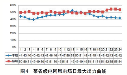 從統(tǒng)計結(jié)果來看,全省風(fēng)電日最大出力豐期的出力范圍為40%~51%,午后12時到下午5時最大出力較高;枯期的出力范圍為49%~55%,晚上9時到凌晨最大出力較高。