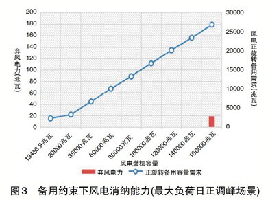 對于備用約束,選取備用需求最大以及火電提供旋備比例最低的場景作為備用約束下的關(guān)鍵場景;逐步增加風(fēng)電裝機容量,使用軟件進(jìn)行運行模擬,直至系統(tǒng)備用不足或者出現(xiàn)棄風(fēng),則該臨界場景下風(fēng)電容量即為備用約束下風(fēng)電可消納容量。