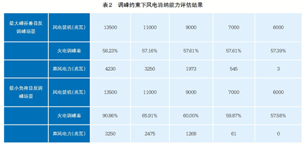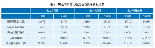 調(diào)峰約束下風(fēng)電消納能力評估。選取確定性場景庫分析指出的影響風(fēng)電消納的調(diào)峰約束關(guān)鍵受限場景:最大峰谷差日反調(diào)峰場景以及最小負(fù)荷日反調(diào)峰場景,逐步增加風(fēng)電裝機容量,使用軟件進(jìn)行運行模擬,直至系統(tǒng)調(diào)峰能力不足出現(xiàn)棄風(fēng),則該臨界場景下風(fēng)電容量即為調(diào)峰約束下風(fēng)電可消納容量。仿真結(jié)果如表2所示。