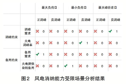 對于調(diào)峰約束,選取調(diào)峰需求最大及火電調(diào)峰率最高的場景作為調(diào)峰約束下的關(guān)鍵場景;逐步增加風(fēng)電裝機容量,使用軟件進(jìn)行運行模擬,直至系統(tǒng)調(diào)峰能力不足出現(xiàn)棄風(fēng),則該臨界場景下風(fēng)電容量即為調(diào)峰約束下風(fēng)電可消納容量。