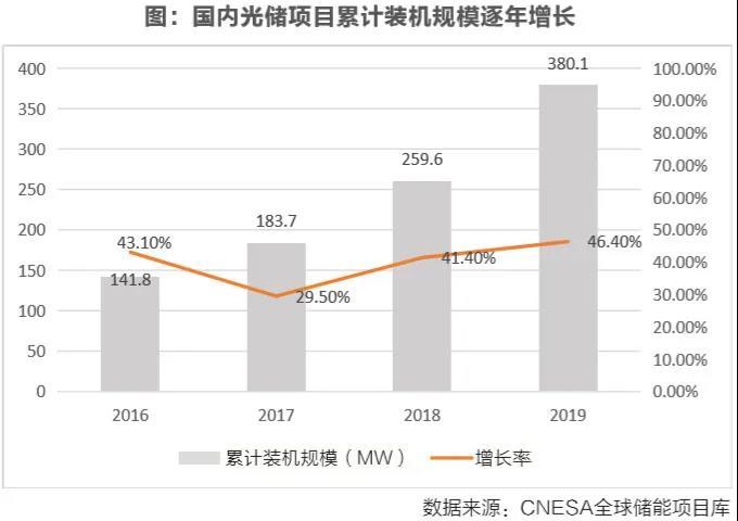 近兩年,國內(nèi)光儲項(xiàng)目發(fā)展迅速,年增長率高達(dá)40%。根據(jù)中關(guān)村儲能產(chǎn)業(yè)技術(shù)聯(lián)盟(CNESA)全球儲能項(xiàng)目庫的不完全統(tǒng)計(jì),截至2019年底,中國已投運(yùn)光伏配置儲能項(xiàng)目累計(jì)裝機(jī)規(guī)模達(dá)到380.1MW,占中國電化學(xué)儲能投運(yùn)項(xiàng)目總規(guī)模的22.6%,年增長率為46.4%。