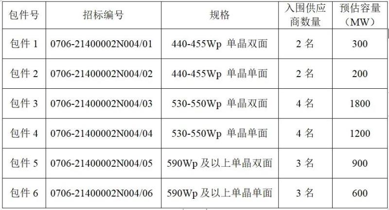 根據(jù)招標(biāo)公告,本次組件框架招標(biāo)采購(gòu)為服務(wù)于中核匯能有限公司/中核山東能源有限公司/中核豐泰新能源開發(fā)有限責(zé)任公司/其他與中核匯能有限公司一體化管理的機(jī)構(gòu)及所屬項(xiàng)目公司2021年12月31日前的擬開工項(xiàng)目(包括自主投資建設(shè)項(xiàng)目和擬收購(gòu)項(xiàng)目),預(yù)計(jì)裝機(jī)總量為5GW。招標(biāo)范圍包括(但不限于)光伏組件產(chǎn)品本體、運(yùn)輸供貨到項(xiàng)目現(xiàn)場(chǎng)及保險(xiǎn)費(fèi)(運(yùn)輸費(fèi)標(biāo)注出單價(jià))、專用工具、備品備件、指導(dǎo)安裝組件設(shè)備、配合系統(tǒng)調(diào)試和驗(yàn)收、培訓(xùn)及其它相關(guān)服務(wù)等費(fèi)用。
