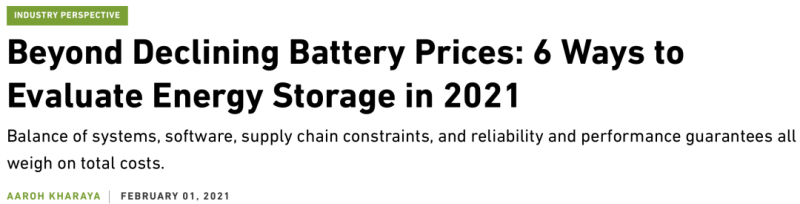 中國儲(chǔ)能網(wǎng)訊:GreenTechMedia發(fā)表電池儲(chǔ)能專家Aaroh Kharaya的文章,題目是:Beyond Declining Battery Prices: 6 Ways to Evaluate Energy Storage in 2021(不僅要看電池價(jià)格:2021年評(píng)估儲(chǔ)能的6種方法),副題是:系統(tǒng)平衡、軟件、供應(yīng)鏈約束、可靠性和性能保證都會(huì)影響總成本。