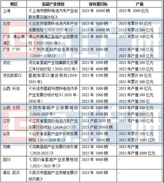 具體來看,據(jù)不完全統(tǒng)計,僅上海、北京、廣東、山西、山東、江蘇、河北、河南、四川、湖北等十個省份及直轄市明確規(guī)劃(如下圖所示),2023/2025年燃料電池汽車保有量分別達到3.5萬輛和7.63萬輛。2020年底國內(nèi)燃料電池汽車保有量在8000輛左右,這意味著未來三年年均銷量需達到9000輛以上,未來五年年均銷量在13660輛以上。