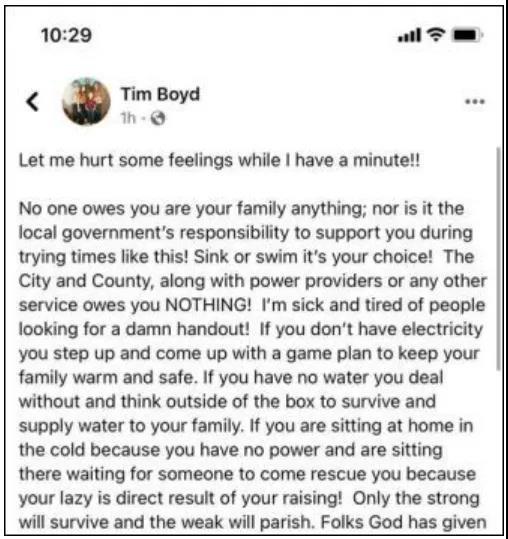 在處理此次居民用電訴求時,德州當(dāng)?shù)匾晃还賳T就因為這種價值觀惹了眾怒。在出現(xiàn)大停電事故后,德州科羅拉多市市長蒂姆·博伊德(Tim Boyd)在社交媒體上說,“沒有人虧欠你或你的家人什么東西;地方政府也沒有責(zé)任在這樣的困難時期支持你們!是沉是浮是你們的選擇!市和郡,以及電力供應(yīng)商或任何其他服務(wù)商不欠你們?nèi)魏螙|西!我厭倦了人們尋求那些該死的施舍,這讓我火冒三丈。”