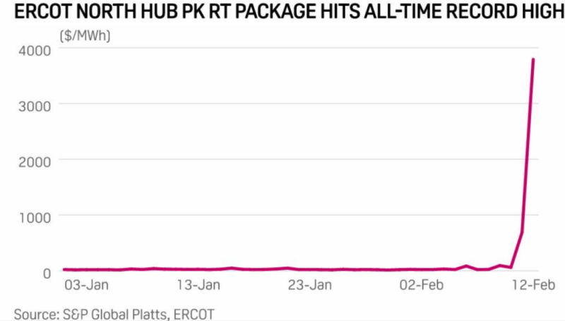 批發(fā)電價從平時約10美分/千瓦時(約合0.645元人民幣/千瓦時),飆升近100倍,至9美元/千瓦時(約合58元人民幣/千瓦時)左右,加上擁堵費等,部分地區(qū)達到12美元/千瓦時。天然氣價格則由日常約8.5美分/立方米(約合0.55元人民幣/立方米),飆升近170倍,至14.26美元/立方米(約合92元人民幣/立方米)。