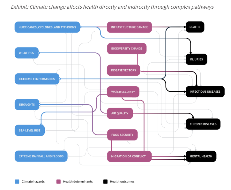 氣候變化的極端天氣事件和趨勢(shì)直接損害健康,但也通過(guò)改變作為環(huán)境、社會(huì)和經(jīng)濟(jì)健康間接損害健康。例如,更頻繁和更強(qiáng)烈的風(fēng)暴可以造成更多的傷害(直接結(jié)果);但它們也可以通過(guò)擾亂緊急和基本的醫(yī)療保?。ㄩg接影響)而增加死亡率。