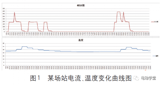 充電模塊工作時散發(fā)熱量排放到柜后密閉空間內(nèi),由于柜后空間容積大,熱氣與原空間內(nèi)空氣混合后溫度先降低再升高,風(fēng)機溫控器安裝于室內(nèi)頂部,與充電模塊間距離遠(yuǎn),造成風(fēng)機溫控器反應(yīng)“遲滯”,設(shè)備整體熱管理效率低。某場站電流、溫度變化曲線圖如圖1所示。