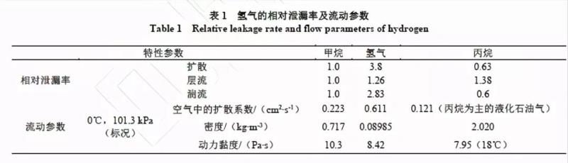 早在90年代,就有科學(xué)家研究了氫氣的泄漏特性,表1列出了氫氣的相對(duì)泄漏率及流動(dòng)參數(shù)。氫氣比其他燃料或氣體泄漏速率更快:在層流狀態(tài)下,氫氣的泄漏速率約為甲烷的1.26倍,而在高壓下,氫氣往往處于湍流狀態(tài),此時(shí)它的泄漏速率更快,約為甲烷的2.83倍。另外,氫氣極易擴(kuò)散,其在薄膜中的擴(kuò)散速度約為甲烷的3.8倍。在非受限空間內(nèi),一旦發(fā)生意外泄漏,由于氫氣密度比空氣低,會(huì)迅速上浮并向四周擴(kuò)散。而在受限空間,泄漏的氫氣易于在局部聚積,由于其高擴(kuò)散性,能夠快速形成危險(xiǎn)的可燃性混合物。