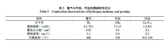 氫氣的燃燒速度很快,暴秀超等人發(fā)現(xiàn)在常溫常壓(27℃,0.1MPa)下,當(dāng)燃空比為1時(shí),氫氣的燃燒速度可達(dá)2m·s-1左右,而天然氣的燃燒速度僅為0.4m·s-1,所以氫氣常常被作為燃料的添加劑用來提升體系的層流燃燒速度。在空氣中,氫氣的燃燒范圍很寬,一般為4.1%-74.1%。另外,氫氣點(diǎn)火能極低,它的最小點(diǎn)火能量大約為0.02mJ,約為汽油的十分之一。表2列出了氫氣及一些常用燃料的燃燒特性參數(shù)。