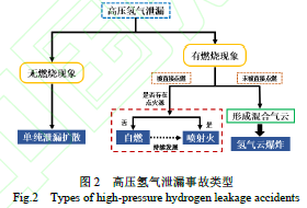 然而,安全性一直是氫能全生命周期運(yùn)行的突出瓶頸問題。由以上可知,高壓又是其中最為突出的風(fēng)險(xiǎn)要素。無論是高壓制氫、高壓儲(chǔ)氫還是高壓運(yùn)氫環(huán)節(jié),如遇到高溫、氫脆破壞或外部撞擊等,極易引發(fā)高壓氫氣的泄漏和擴(kuò)散,甚至更為嚴(yán)重的火災(zāi)和爆炸事故災(zāi)害。根據(jù)高壓氫氣的泄漏行為,可將事故總體分為無燃燒泄漏擴(kuò)散和有燃燒泄漏兩種,如圖2所示。無燃燒泄漏擴(kuò)散,即高壓氫氣只發(fā)生單純的泄漏擴(kuò)散,未遇點(diǎn)火源或發(fā)生自燃。有燃燒泄漏則可分為三種情形:一是當(dāng)氫氣泄漏形成射流后,遇到點(diǎn)火源引發(fā)噴射火;二是雖無外部點(diǎn)火源,但高壓氫氣發(fā)生了自燃,并且可能發(fā)展為噴射火;三是氫氣泄漏后先是在一定空間內(nèi)與空氣混合形成氣云,此時(shí)若遇到點(diǎn)火源,則極易發(fā)生氫氣云爆炸。僅2019年,挪威、美國(guó)就相繼發(fā)生多起氫氣爆炸,事故起因分別是氫氣云爆炸和氫氣自燃引發(fā)的連鎖爆炸,這些再一次引發(fā)公眾對(duì)氫能安全的廣泛關(guān)注、擔(dān)憂甚至恐慌。亟需對(duì)高壓氫氣的安全問題開展系統(tǒng)地研究和闡述,充分掌握事故演化規(guī)律,為氫能安全防控技術(shù)開發(fā)及安全標(biāo)準(zhǔn)制定提供科學(xué)依據(jù)和有力工具。