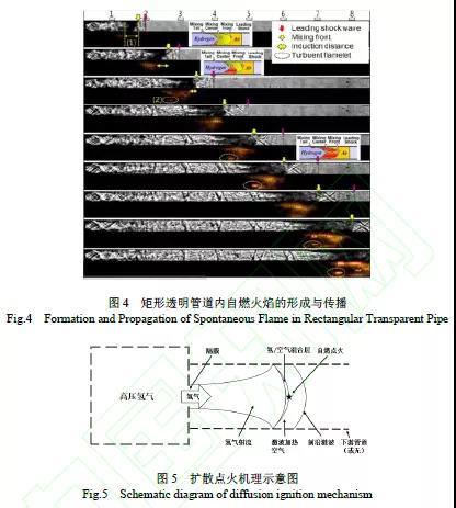 近年來,高壓氫氣泄漏自燃成為了氫安全領(lǐng)域的研究熱點(diǎn)。如Kim等人在矩形透明管道中完整記錄了自燃火焰的形成過程(如圖4所示),在氫/空氣混合層前鋒面的后方管壁上發(fā)現(xiàn)高度混合點(diǎn),自燃火焰首先在該處出現(xiàn),隨后傳播至氫/空氣混合層的首尾部。