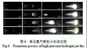若高壓氫氣泄漏后被點(diǎn)燃(外部點(diǎn)火源或發(fā)生氫氣自燃)則很可能引發(fā)噴射火。近期,Jiang 等人利用高速照相機(jī)記錄下了管道出口處自燃火焰轉(zhuǎn)化成噴射火的全過程(如圖6),在火焰?zhèn)鞑サ某跗?,距離噴嘴一定距離處會(huì)形成馬赫盤,其背面出現(xiàn)扁平火焰,隨后噴嘴處的火焰逐漸消失,而由馬赫盤下游的火焰繼續(xù)傳播并最終形成噴射火。除了火焰?zhèn)鞑ゼ捌滢D(zhuǎn)變過程外,噴射火特性參數(shù)的影響因素也是重點(diǎn)研究方向。閆偉陽等人探究了不同管長(zhǎng)和泄放壓力下噴射火尺寸及火焰尖端平均速度變化。Henriksen等人使用圖像處理工具分析了實(shí)驗(yàn)結(jié)果并給出了噴嘴幾何形狀與火焰尺寸的定量關(guān)系式。Hooker等人通過改變氫氣釋放速率和排氣孔配置進(jìn)行了通風(fēng)罩內(nèi)氫氣噴射火的實(shí)驗(yàn)研究。但目前相關(guān)的實(shí)驗(yàn)研究也受到尺度的限制,且較少考察環(huán)境因素、障礙物,特別是不同點(diǎn)火機(jī)制(明火、電火花、高溫或氫氣自燃)等的影響,實(shí)驗(yàn)結(jié)果具有一定的局限。
