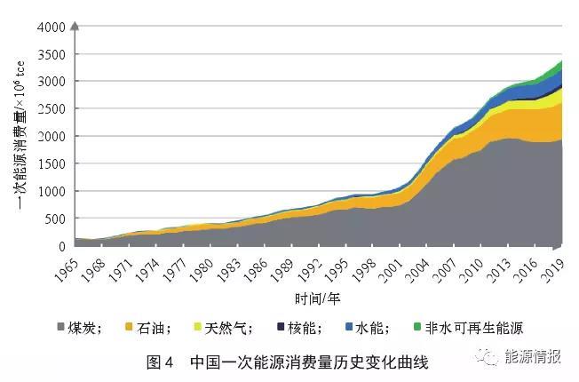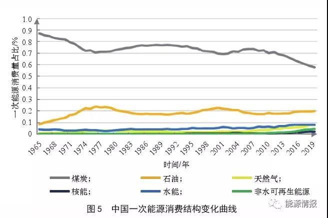 1965—2019 年,一次能源消費量(見圖 4)及消費結(jié)構(gòu)(見圖 5)的變化情況顯示:我國一次能源消費量從 1.87×108 tce 增長到 4.83億tce,年均增長率為 6.25%;而能源相關(guān) CO2排放量則從 4.89億t 增加到 98.3億t,年均增長率為 5.74%;在此期間,煤炭始終占據(jù)能源主力位置,但占比從87.0%下降至 57.4%。