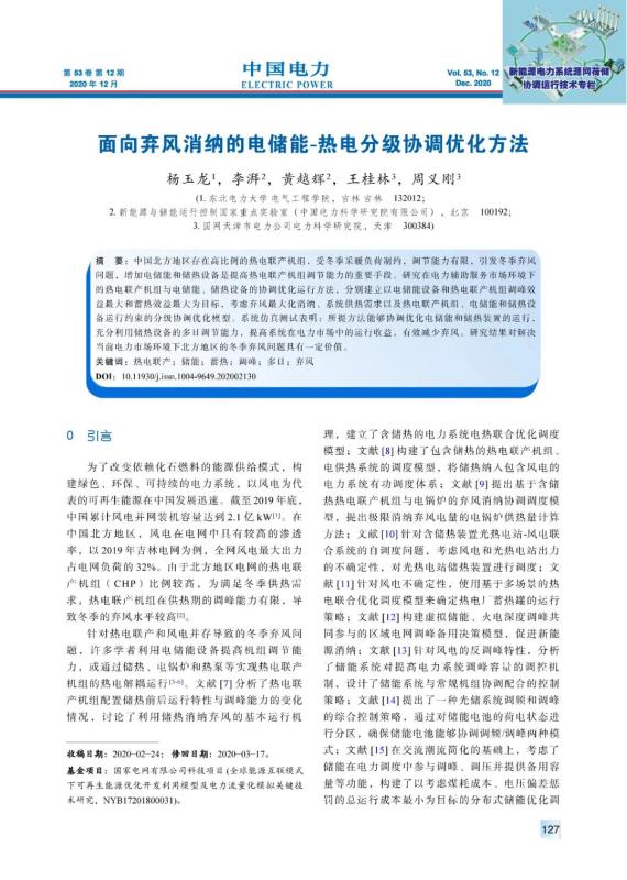 楊玉龍, 李湃, 黃越輝, 等. 面向棄風(fēng)消納的電儲能-熱電分級協(xié)調(diào)優(yōu)化方法[J]. 中國電力, 2020, 53(12): 127-135.