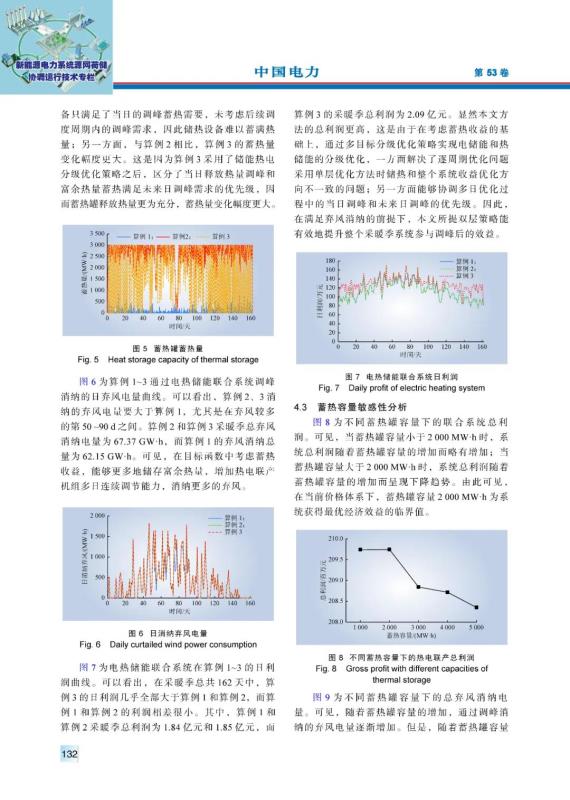 通過增加熱電聯(lián)產(chǎn)配置的儲熱設(shè)備容量,能夠增加其多日棄風(fēng)消納電量,但是系統(tǒng)成本會相應(yīng)增加,系統(tǒng)中存在經(jīng)濟(jì)性和清潔性協(xié)調(diào)最優(yōu)下的蓄熱容量值。在本算例系統(tǒng)中,蓄熱容量2 000 MW·h是獲得調(diào)峰效益的最優(yōu)點(diǎn)。蓄熱容量為3000 MW·h是增加消納棄風(fēng)電量的拐點(diǎn)。當(dāng)棄風(fēng)消納的深度調(diào)峰價(jià)格大于100元/(MW·h)時(shí),深度調(diào)峰利潤大于0,且隨著價(jià)格的增加而增加,與現(xiàn)行輔助服務(wù)市場價(jià)格相比,具有經(jīng)濟(jì)可行性和競爭力。