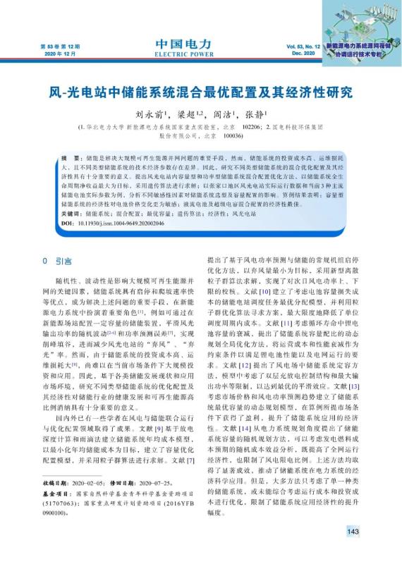 劉永前, 梁超, 閻潔, 等. 風-光電站中儲能系統(tǒng)混合最優(yōu)配置及其經(jīng)濟性研究[J]. 中國電力, 2020, 53(12): 143-150.