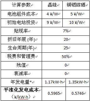 平準(zhǔn)化發(fā)電成本(LCOE)常用來分析不同發(fā)電技術(shù)在其生命周期內(nèi)的經(jīng)濟(jì)性,該方法綜合考慮了光伏電站當(dāng)前投資、運(yùn)行費(fèi)用與總發(fā)電量以及稅率和管理費(fèi)、貼現(xiàn)率等多種影響因素。通過對(duì)銅銦鎵硒薄膜太陽能電池和晶硅太陽能電池在分布式光伏電站的平準(zhǔn)化發(fā)電成本(*數(shù)據(jù)來自云南石林光伏電站)的分析(計(jì)算條件如列表),可以看出銅銦鎵硒薄膜太陽能電池即使在目前其組件成本比晶硅太陽能電池組件成本高25%的不利情況下,都比晶硅太陽能電池在發(fā)電成本上更具優(yōu)勢。因此,隨著銅銦鎵硒薄膜太陽能電池組件效率的大幅改善以及生產(chǎn)企業(yè)實(shí)現(xiàn)吉瓦級(jí)產(chǎn)品規(guī)模,銅銦鎵硒薄膜太陽能電池將必然地成為光伏發(fā)電的主流產(chǎn)品。