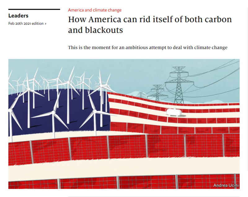 英國(guó)《經(jīng)濟(jì)學(xué)人》雜志發(fā)表文章,題目是:How America can rid itself of both carbon and blackouts(美國(guó)如何擺脫碳排放和停電)。