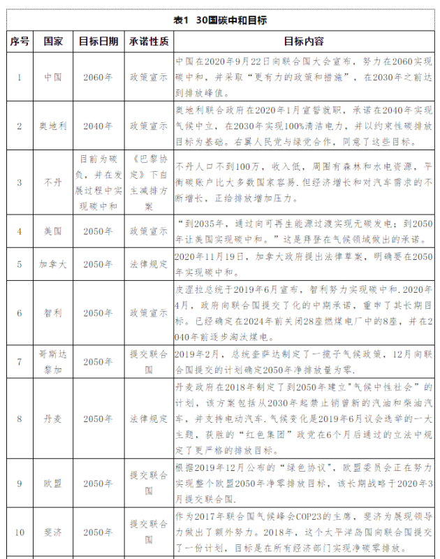 國際能源網(wǎng)通過數(shù)據(jù)整理發(fā)現(xiàn),截止目前,已經(jīng)有30個國家明確提出了碳排放目標(biāo)。具體詳見表1 30國碳中和目標(biāo)。