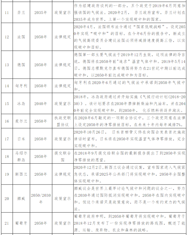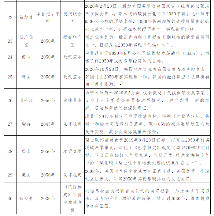 英國、歐盟、法國、德國、美國、日本、韓國、加拿大、南非等22個國家把實(shí)現(xiàn)碳中和的目標(biāo)年份定在2050年。而烏拉圭(2030年)、芬蘭(2035年)、冰島(2040年)、奧地利(2040年)、瑞典(2045年)5國的碳中和目標(biāo)年份是2030年-2045年,其中半數(shù)是北歐國家。新加坡則承諾將在本世紀(jì)下半葉盡快實(shí)現(xiàn)凈零排放。