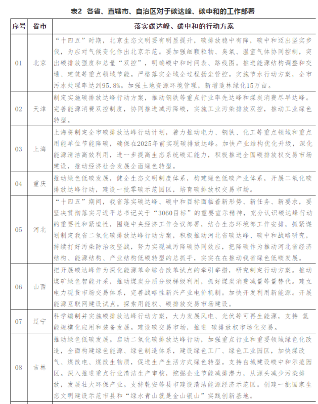 在省級層面,上海、福建、海南、青海等地提出在全國達(dá)峰之前率先達(dá)峰,天津、上海、河北、山西、江蘇、安徽、福建、江西、山東、河南、陜西、遼寧、湖北、海南、四川、甘肅、西藏共17個省、直轄市、自治區(qū)提出2021年將研究、制定實(shí)施二氧化碳排放達(dá)峰行動方案。各地2021年政府工作報告中對于實(shí)現(xiàn)碳達(dá)峰的詳細(xì)部署工作見下表2.