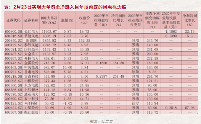 值得一提的是,目前市場(chǎng)做多資金也紛紛涌入風(fēng)電績(jī)優(yōu)股進(jìn)行布局。《證券日?qǐng)?bào)》記者根據(jù)同花順數(shù)據(jù)統(tǒng)計(jì)發(fā)現(xiàn),2月23日,板塊內(nèi)共有33只風(fēng)電概念股呈現(xiàn)大單資金凈流入態(tài)勢(shì)。其中,有19只年報(bào)預(yù)喜股備受大單資金的青睞,合計(jì)吸金2.57億元。長(zhǎng)江電力、節(jié)能風(fēng)電、新強(qiáng)聯(lián)、泰勝風(fēng)能、國(guó)軒高科、大金重工等6只年報(bào)預(yù)喜股大單資金凈流入均在千萬元以上,包括晉控電力、金雷股份、中閩能源、甘肅電投等在內(nèi)的13只年報(bào)預(yù)喜股當(dāng)日也獲大單資金追捧,后市表現(xiàn)值得期待。