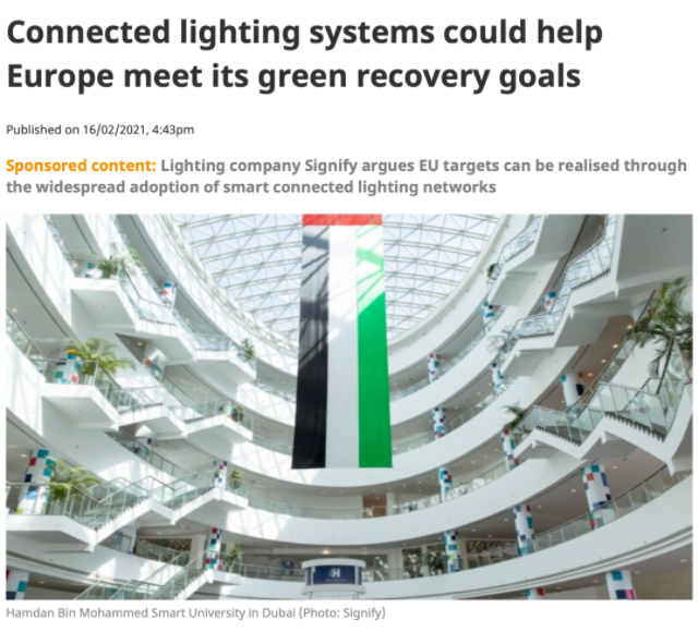 中國儲(chǔ)能網(wǎng)訊:據(jù)ClimateNews網(wǎng)站報(bào)道,照明燈具公司Signify認(rèn)為,廣泛采用智能連接的照明網(wǎng)絡(luò)可推動(dòng)實(shí)現(xiàn)綠色轉(zhuǎn)型和碳中和。2018年,該公司在迪拜的哈姆丹·本·穆罕默德智能大學(xué)(HBMSU)安裝了最先進(jìn)的聯(lián)網(wǎng)照明系統(tǒng),這是一個(gè)沒有電燈開關(guān)的學(xué)習(xí)環(huán)境。