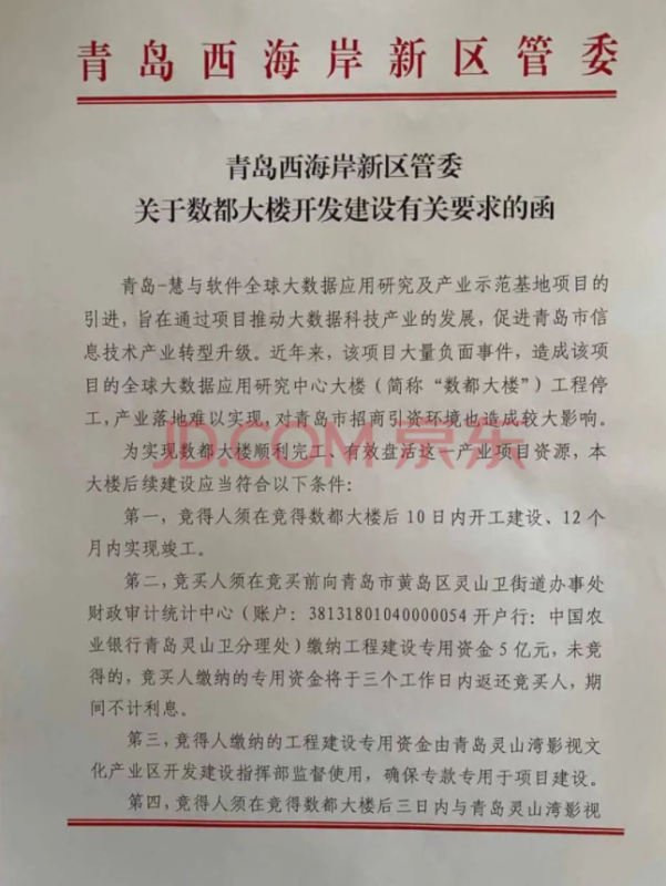 從現(xiàn)場照片看,建筑主體已基本完工。而此次拍賣目的也為青島西海岸新區(qū)管委為繼續(xù)完成“中國數(shù)都”項目,盤活資產(chǎn)而進行。