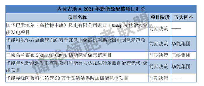 2021年截至今日,五大四小集團(tuán)已有16個(gè)新能源配儲(chǔ)項(xiàng)目處于前期規(guī)劃當(dāng)中,約占2020全年五大四小集團(tuán)投建新能源配儲(chǔ)項(xiàng)目總個(gè)數(shù)的42%。如上文提到的三峽烏蘭察布新一代電網(wǎng)友好綠色電站示范項(xiàng)目、華潤(rùn)電力湖北應(yīng)城龍湖風(fēng)電場(chǎng)10MW/10MWh儲(chǔ)能項(xiàng)目等,都是最新發(fā)布的項(xiàng)目。