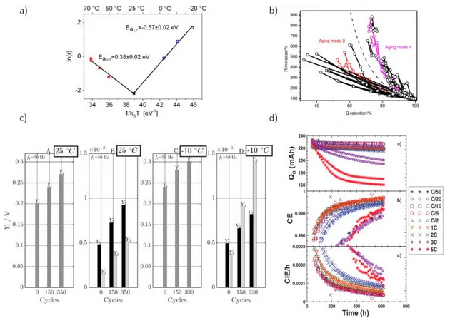無損的析鋰觀測技術對于實際的電池應用很重要。一般可用于析鋰表征的檢測包括SEM,TEM,NMR和XRD等,但這些手段都需要對電池進行破壞或使用特殊電池構型。常用的無損析鋰觀測利用電池的外部特性,包括老化速率,鋰回嵌的電壓平臺,模型預測等方法。如圖6所示,基于老化特征的析鋰檢測手段包括(a)阿倫尼烏斯方程,(b)衰減過程的容量和阻抗變化分析,(c)非線性頻域響應分析和(d)庫倫效率分析。
