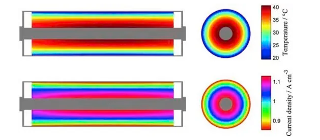 圖3 圓柱電池內(nèi)部溫度和電流密度的分布仿真結果