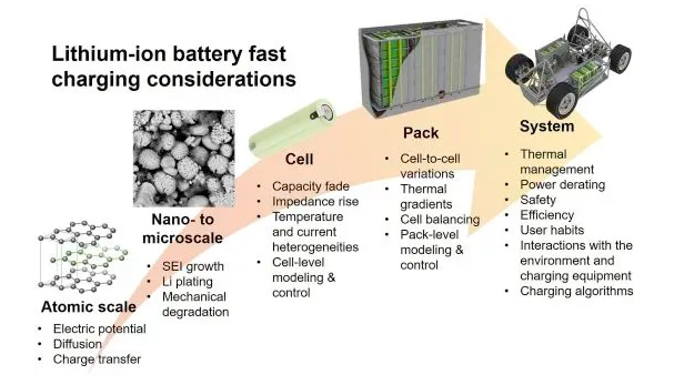 盡管提高電動車充電功率的研究已有較大進展,但這些快充技術并不在所有情況下適應。根據(jù)電動車的特定工況和充電環(huán)境,持續(xù)充電過程中,充電功率會逐漸衰減。此外,快充模式下,由于安全等因素限制,電池通常只能充至80%的電量;更高電量下,充電倍率會逐漸減小以避免過充。此外,充電功率還受到電池管理系統(tǒng)(BMS)的限制。工業(yè)界對電池快充領域的興趣越來越濃厚,理解清楚不同充電方法的決速步驟及其對電池壽命的影響十分必要。本文旨在從快速充電的多尺度和多學科特性出發(fā),建立微觀過程、材料特性、電池及Pack設計和充電策略優(yōu)化之間的聯(lián)系。