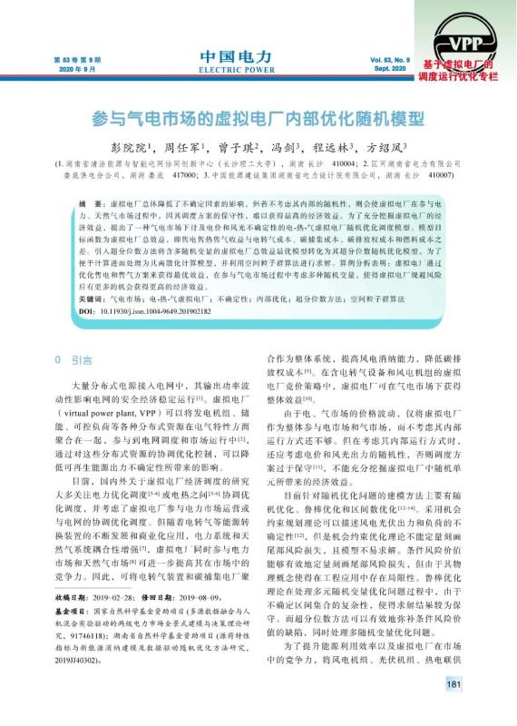 PENG Yuanyuan, ZHOU Renjun, ZENG Ziqi, et al. Internal optimization stochastic model of virtual power plant participating in gas and electricity market[J]. Electric Power, 2020, 53(9): 181-188.